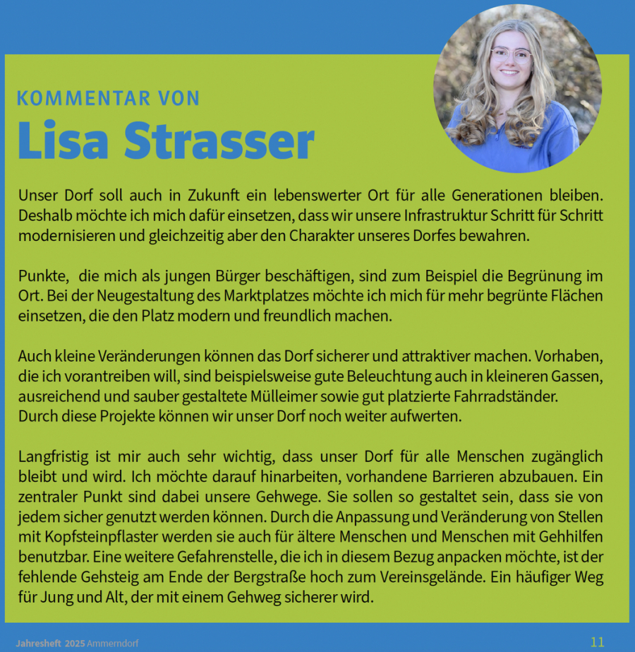 Ich bin Abiturientin und kandidiere für den Gemeinderat, weil meine Heimat Ammerndorf mir am Herzen liegt und ich die Zukunft unserer Gemeinde aktiv mitgestalten möchte.